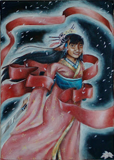 This is one of my favorite paintings because of its Asian inspired concept. I made this artwork because my little sister requested for it, as a Birthday gift for her 12th birthday. She wanted herself to be painted as a Japanese princess with the theme of the spring season. So, I made her hair longer than it actually is and placed ornaments on it that resembles that of a Japanese princess. The ribbons were added just for composition's sake. Then, to add a spring season atmosphere to the painting, I layered the dark background with cherry blossoms falling from the sky.